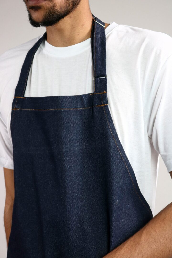 Denim Bib Apron – Classic with self-fabric ties on waist plus one centre division pocket. The Classic Denim Bib Apron caters for the client that wants a smart apron with all the bells and whistles. Don’t be fooled by the price when it comes to the Classic Denim Bib Apron. This apron has been designed to provide the user with a contemporary look, providing the ultimate in comfort with extra wide waist and neckties together with adjustable neck slider. A durable denim fabric that will give the user the necessary protection against the elements faced on a day to day basis. Nothing beats denim when it comes to styling, functionality and durability. We use a standard 12oz. (approx.) denim poly-cotton blend fabric that makes a perfect wash and wears the garment. The cut of the apron is a rather generous one. Special attention to the stitch work is a standard on these garments. High-quality threads and trims are used. All the hems including the pockets are double stitched and tacked together with high-quality contrast thread specifically used for denim. Garments are machine washable and can be ironed. Please take special care not to iron on prints.